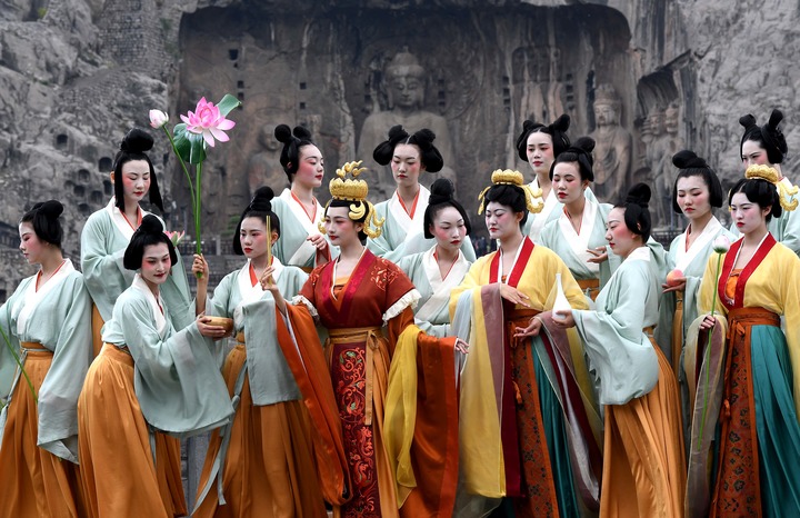 演员在洛阳龙门石窟景区礼佛台演绎《文昭皇后礼佛图》(2021年4月25日摄)。新华社记者 李安 摄