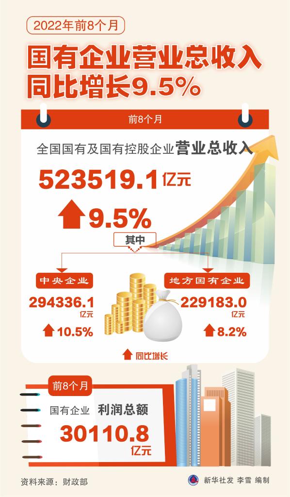 财政部日前发布数据显示,今年前8个月,全国国有及国有控股企业营业总收入523519.1亿元,同比增长9.5%,国有经济运行延续恢复态势。新华社发 李雪 编制