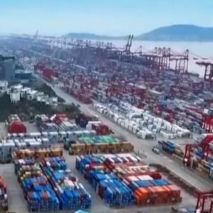 岸边,三千多个集装箱,装满中国生产的光伏设备、电子机械、日用百货,也等待这艘大船将它们运往世界各地。