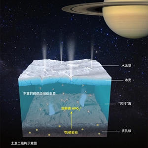 土卫二是土星第二颗被人类发现的卫星,它的一大特点是表面覆盖着厚厚的冰壳,又被称为“冰卫星”。20世纪80年代以来,国际科学界通过航天探测器发现土卫二隐藏着冰下海洋,分析它从冰缝中喷发出的冰粒,发现含有生命六种基本构成元素中的碳、氢、氧、氮和硫,唯独还未发现磷。