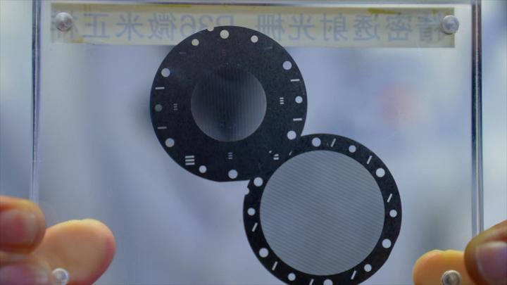 太阳硬X射线成像仪的金属钨光栅。新华社记者林凯 摄