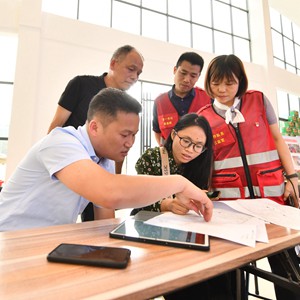 2022年5月6日,广西柳州市融安县大坡乡岗伟村驻村第一书记黄晨晖(后排右)和乡镇干部、工程设计人员在大坡飞鸡农特产品大数据中心讨论岗伟村产业示范带方案。新华社记者 黄孝邦 摄