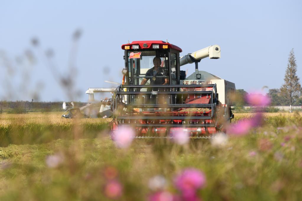 在安徽省合肥市巢湖市槐林镇,农机手操作收割机在田间收割水稻。新华社记者 张端 摄