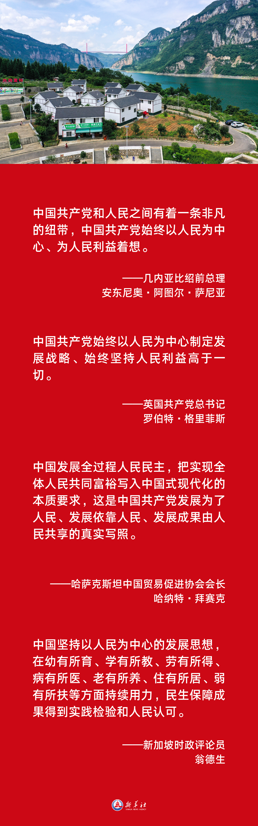 英国共产党总书记罗伯特·格里菲斯高度赞赏中国共产党始终以人民为中心制定发展战略、始终坚持人民利益高于一切。格里菲斯说:“我看到了中国各地人民生活水平的提高、住房和教育条件的改善,看到引人注目的现代交通系统,也看到了中国人民充满自豪的表情。”