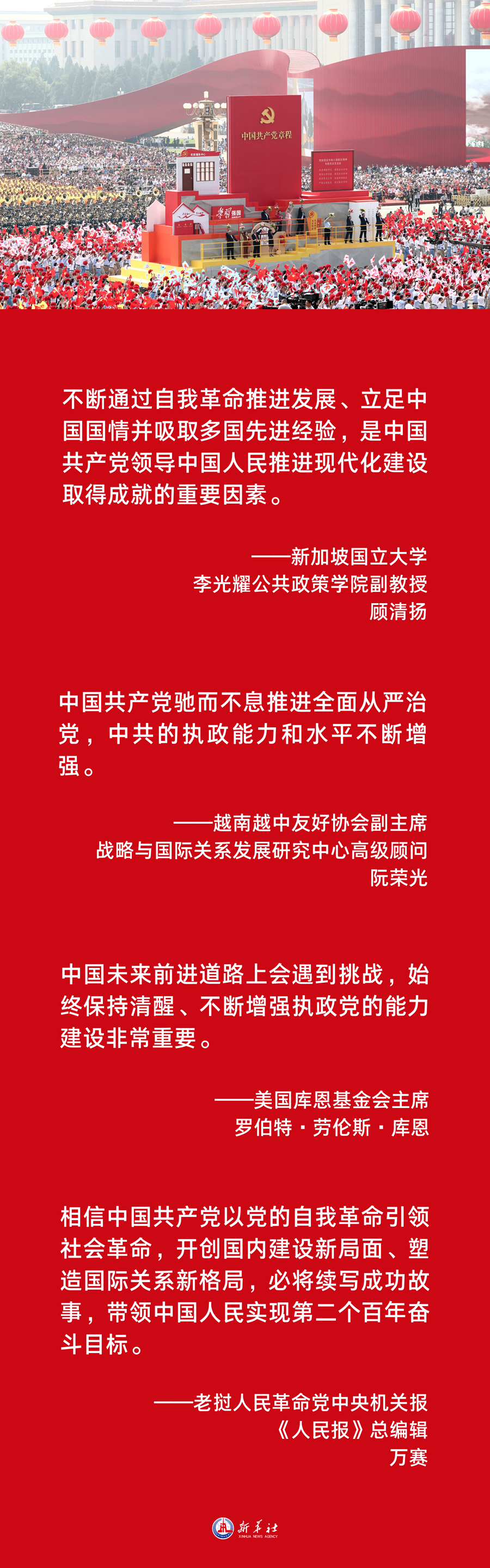 “中国共产党近年来在全面从严治党方面成就显著,令人印象深刻。”老挝人民革命党中央机关报《人民报》总编辑万赛说,中国共产党善于学习和创新,不断总结经验并探索前进道路。“相信中国共产党以党的自我革命引领社会革命,开创国内建设新局面、塑造国际关系新格局,必将续写成功故事,带领中国人民实现第二个百年奋斗目标。”
