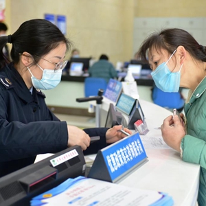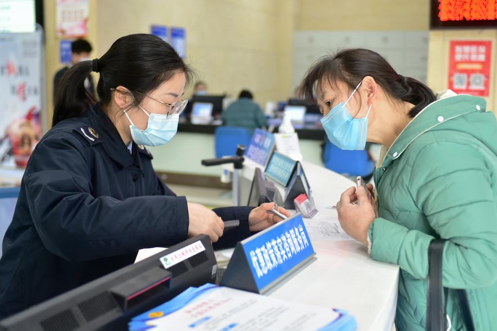 2021年2月5日,在福州经济技术开发区税务局办税服务厅,外来务工人员田道彩(右)在缴交个人基本养老保险费。新华社记者 魏培全 摄
