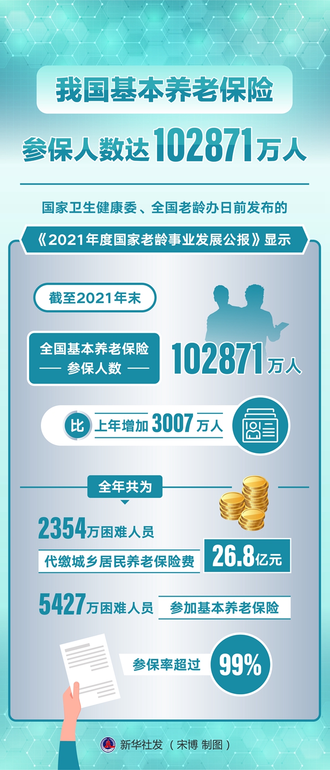 新华社北京10月26日电(记者董瑞丰、李恒)国家卫生健康委、全国老龄办日前发布的《2021年度国家老龄事业发展公报》显示,截至2021年末,全国基本养老保险参保人数102871万人,比上年增加3007万人。全年共为2354万困难人员代缴城乡居民养老保险费26.8亿元,5427万困难人员参加基本养老保险,参保率超过99%。