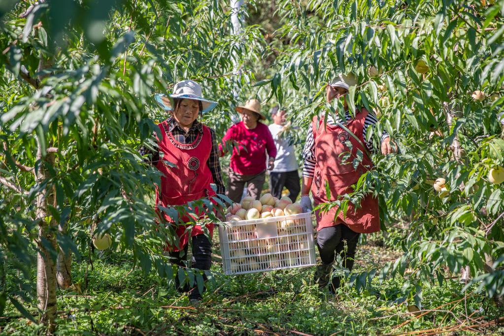 10月13日,在重庆市巫溪县峰灵镇谭家村,村民在搬运刚刚采摘的冬桃。新华社记者黄伟 摄