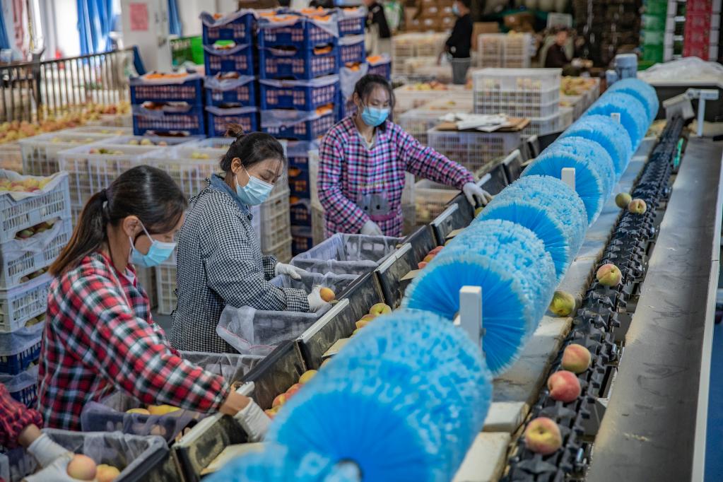 10月13日,在重庆市巫溪县峰灵镇,工作人员在分选包装车间对冬桃进行分级。新华社记者黄伟 摄