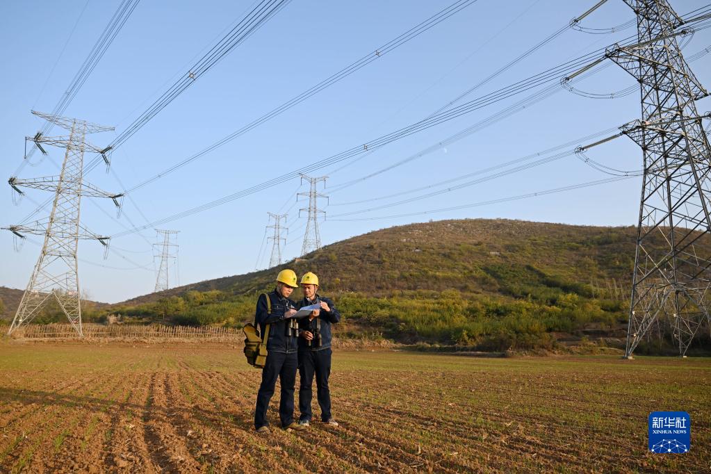 11月2日,在宿州市埇桥区符离镇,廖志斌(右)和同事对输电线路进行巡检。