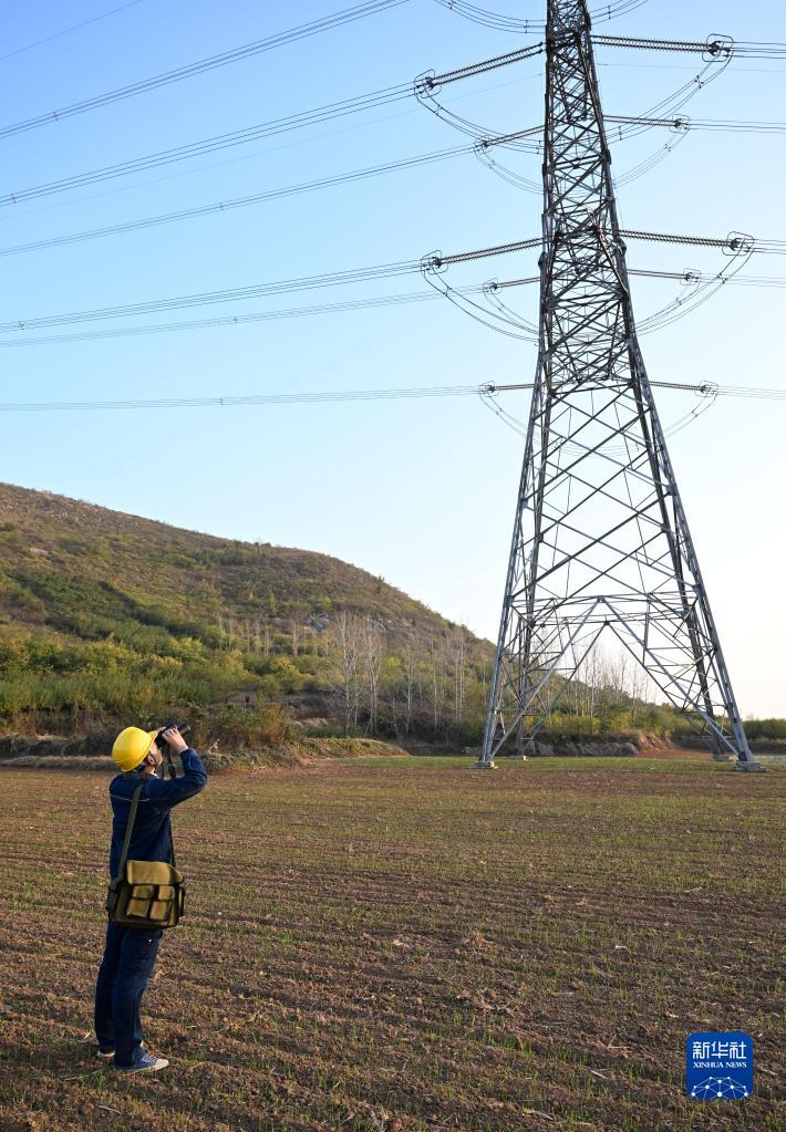 11月2日,在宿州市埇桥区符离镇,廖志斌用望远镜对输电线路进行巡检。