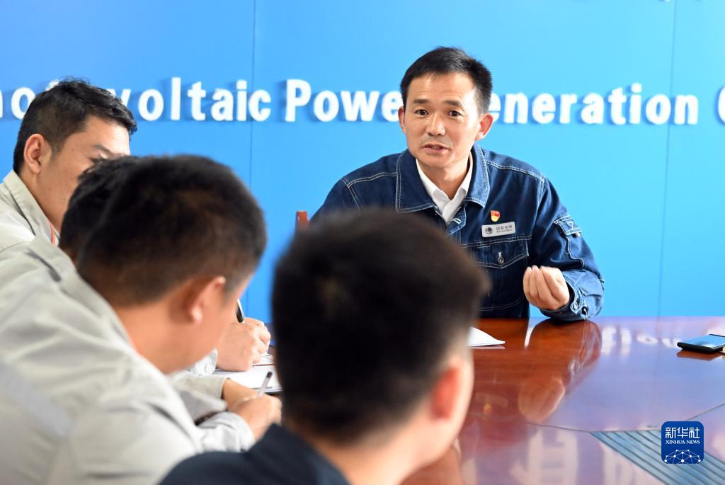 11月2日,廖志斌(右)在宿州市符阳光伏发电有限公司宣讲党的二十大精神。