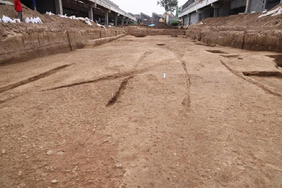 这是安阳殷墟遗址新发现的大型道路路面上的车辙。(资料照片)