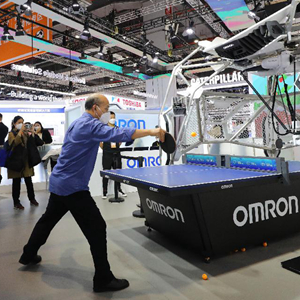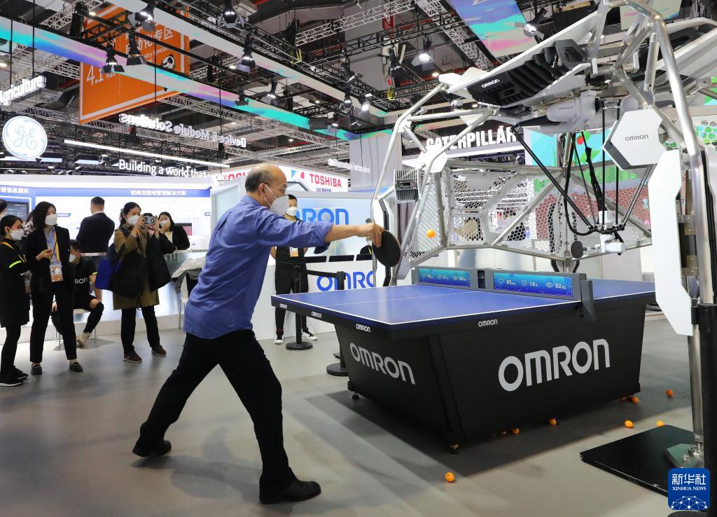 11月6日,参观者在第五届进博会欧姆龙公司展台与乒乓球机器人互动。欧姆龙公司连续参加五届进博会,本届进博会上展出的乒乓球机器人是该系列的第七代产品。新华社记者 方喆 摄