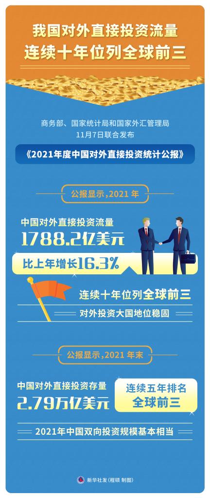 新华社北京11月7日电 商务部、国家统计局和国家外汇管理局7日联合发布《2021年度中国对外直接投资统计公报》。公报显示,2021年,中国对外直接投资流量1788.2亿美元,比上年增长16.3%,连续十年位列全球前三,对外投资大国地位稳固。