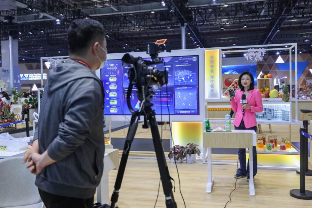 2021年11月8日,记者在进博会场馆内出镜报道。新华社记者 王翔 摄