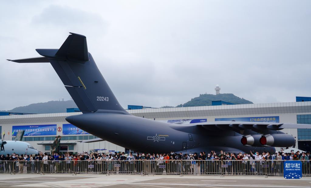 11月8日,观众在第十四届中国航展静态展示区的空军运-20前观看。新华社发(栾铖 摄)