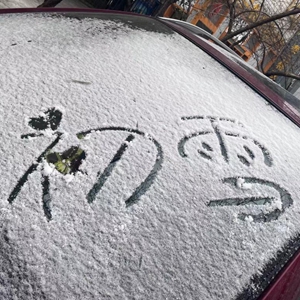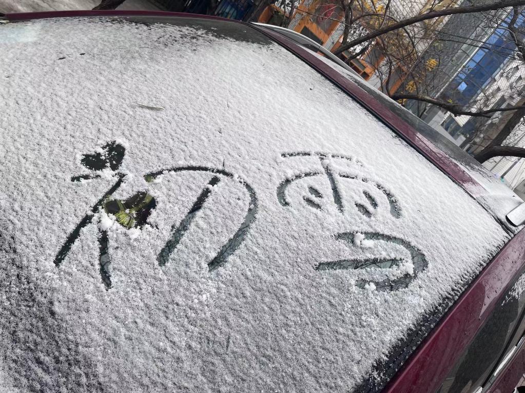 黑龙江省哈尔滨市民在车窗上写下“初雪”二字。新华社记者 杨思琪 摄