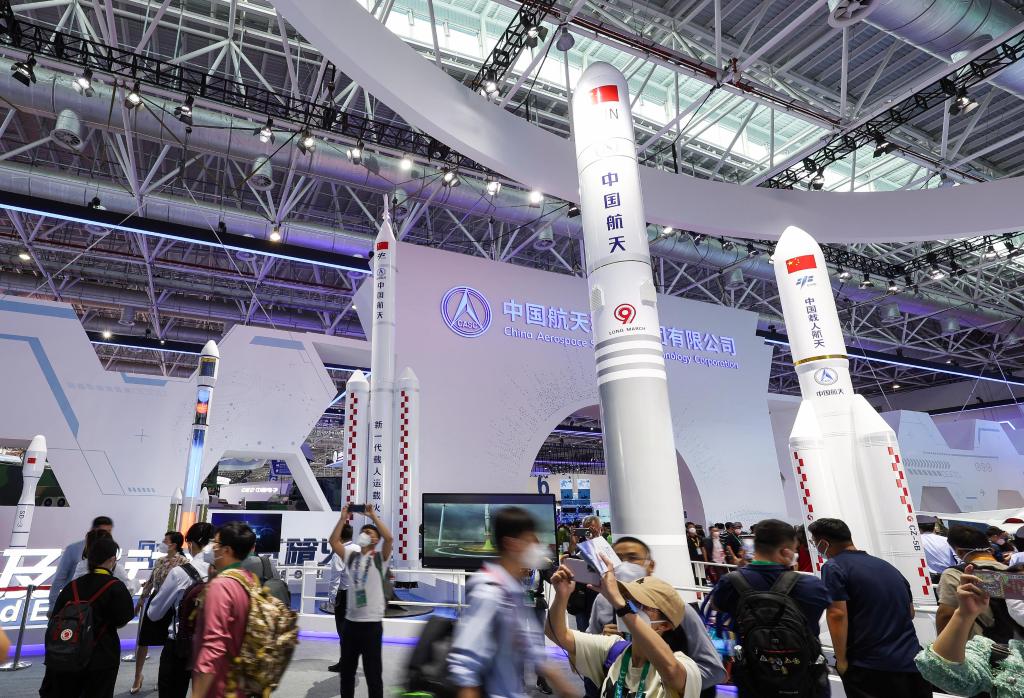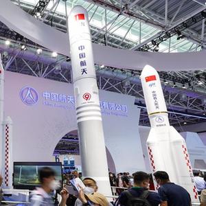 展馆内陈列的长征五号B、捷龙三号等运载火箭展现出中国不断提升火箭运载能力,为探空运输更多物资和设备的实力和决心。