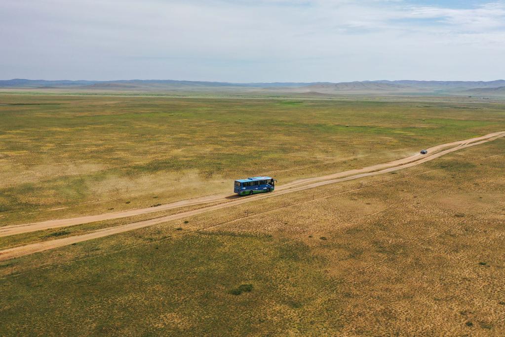 8月17日,苏尼特右旗乌兰牧骑队员乘车前往牧区(无人机照片)。新华社记者 刘磊 摄