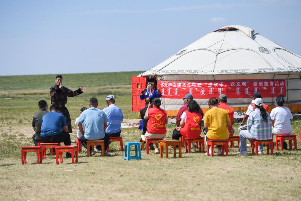 8月17日,在敦达乌苏嘎查演出点,乌兰牧骑队员在表演节目。新华社记者 刘磊 摄