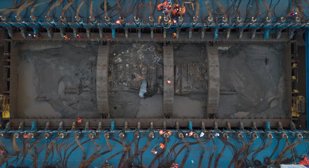 长江口泥沙多导致水下能见度几乎为零,流快浪高使潜水有效时间接近“砍半”。执行古船打捞任务的潜水员抓住有效时间窗口,累计下潜892人次,水下作业时长达2230多小时,完成了箱体下沉、弧形梁穿孔等关键工作。