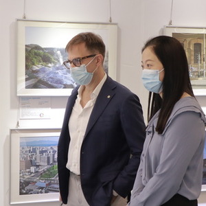 意大利天文学者丹尼斯·巴丹尼(左)在广州图书馆参观广州友好城市摄影展(10月20日摄)。 新华社记者 洪泽华 摄
