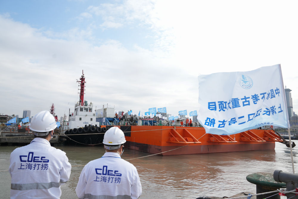 11月25日,“奋力”轮装载着长江口二号古船进入上海船厂旧址1号船坞。