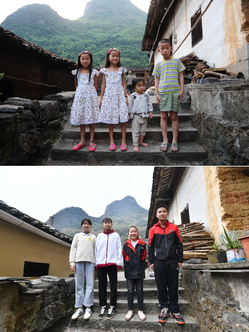 拼版照片上图:在广西大化瑶族自治县板升乡弄雷村哈保屯,11岁的蒙秋艳(右一)在悬崖边护着低年级的小伙伴回家(2012年9月3日摄);下图:已经是广西医科大学大二学生的蒙秋艳(中)和小伙伴们在家门口合影(2022年8月23日摄)。