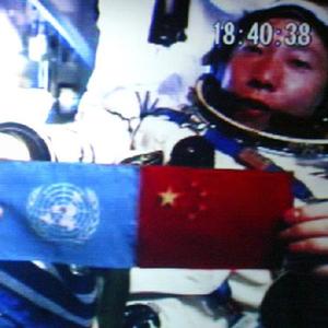 2003年10月15日18时40分,中国第一位航天员杨利伟从太空向世界各国人民问好,并在舱内并列展示了五星红旗和联合国旗(摄于北京航天指挥控制中心大屏幕)。新华社发