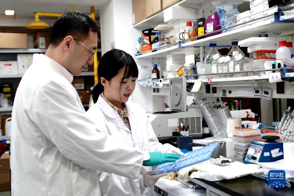 12月2日,在中国科学院分子细胞科学卓越创新中心实验室,周斌(左)和赵欢讨论实验数据。新华社记者 张建松 摄