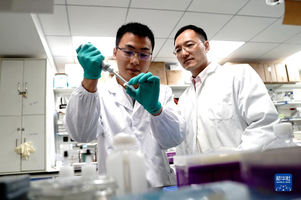 12月2日,在中国科学院分子细胞科学卓越创新中心实验室,周斌(右)指导张少华进行实验。新华社记者 张建松 摄