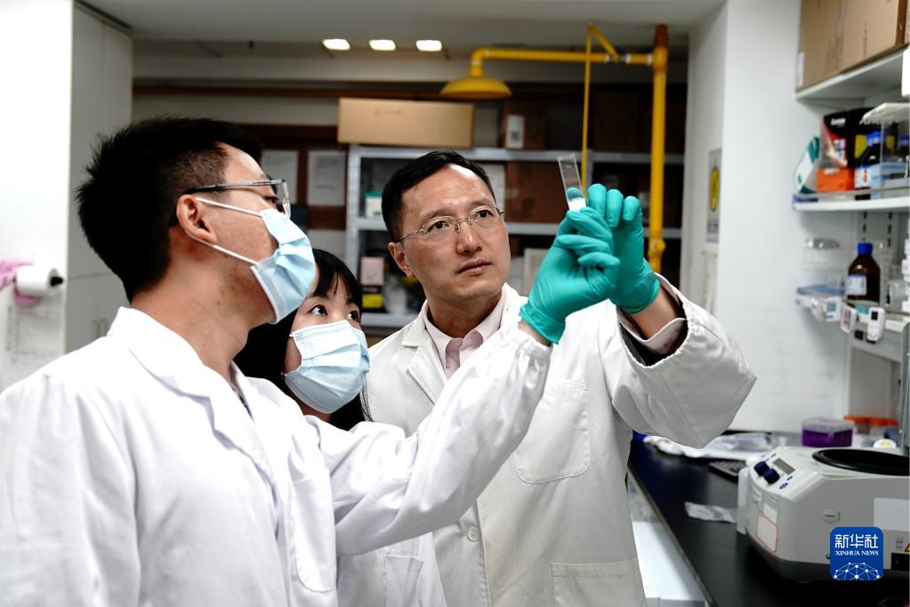 12月2日,在中国科学院分子细胞科学卓越创新中心实验室,周斌(右)和赵欢(中)、张少华一起分析组织切片。新华社记者 张建松 摄