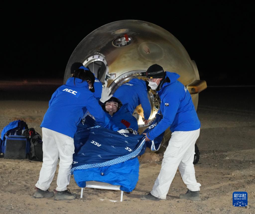 12月4日,神舟十四号载人飞船返回舱在东风着陆场成功着陆。这是航天员蔡旭哲安全顺利出舱。新华社记者 李刚 摄