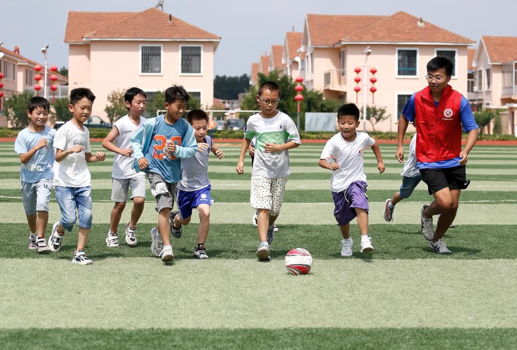 7月18日,在青岛市即墨区龙山街道前东葛村,山东理工大学大学生志愿者与孩子们一起踢足球。新华社发(梁孝鹏 摄)