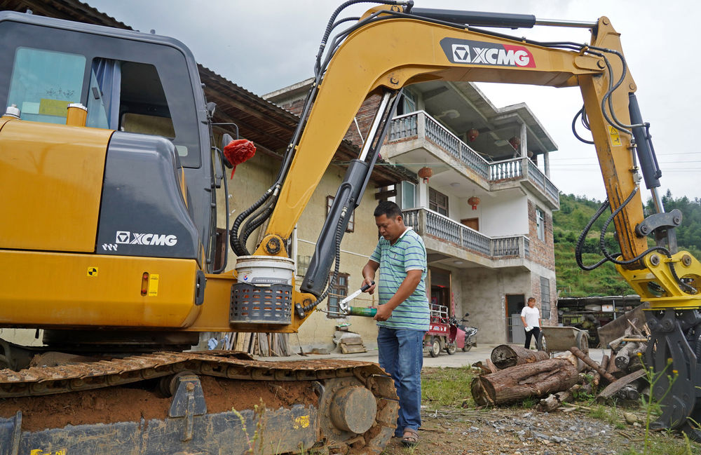吴年有在家门前检修挖掘机(2020年9月10日摄)。