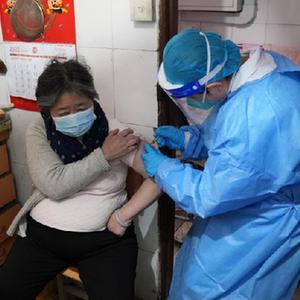 12月5日,上海,在因行动不便申请入户接种的徐阿姨家,护士为老人接种新冠疫苗。新华社记者 刘颖 摄
