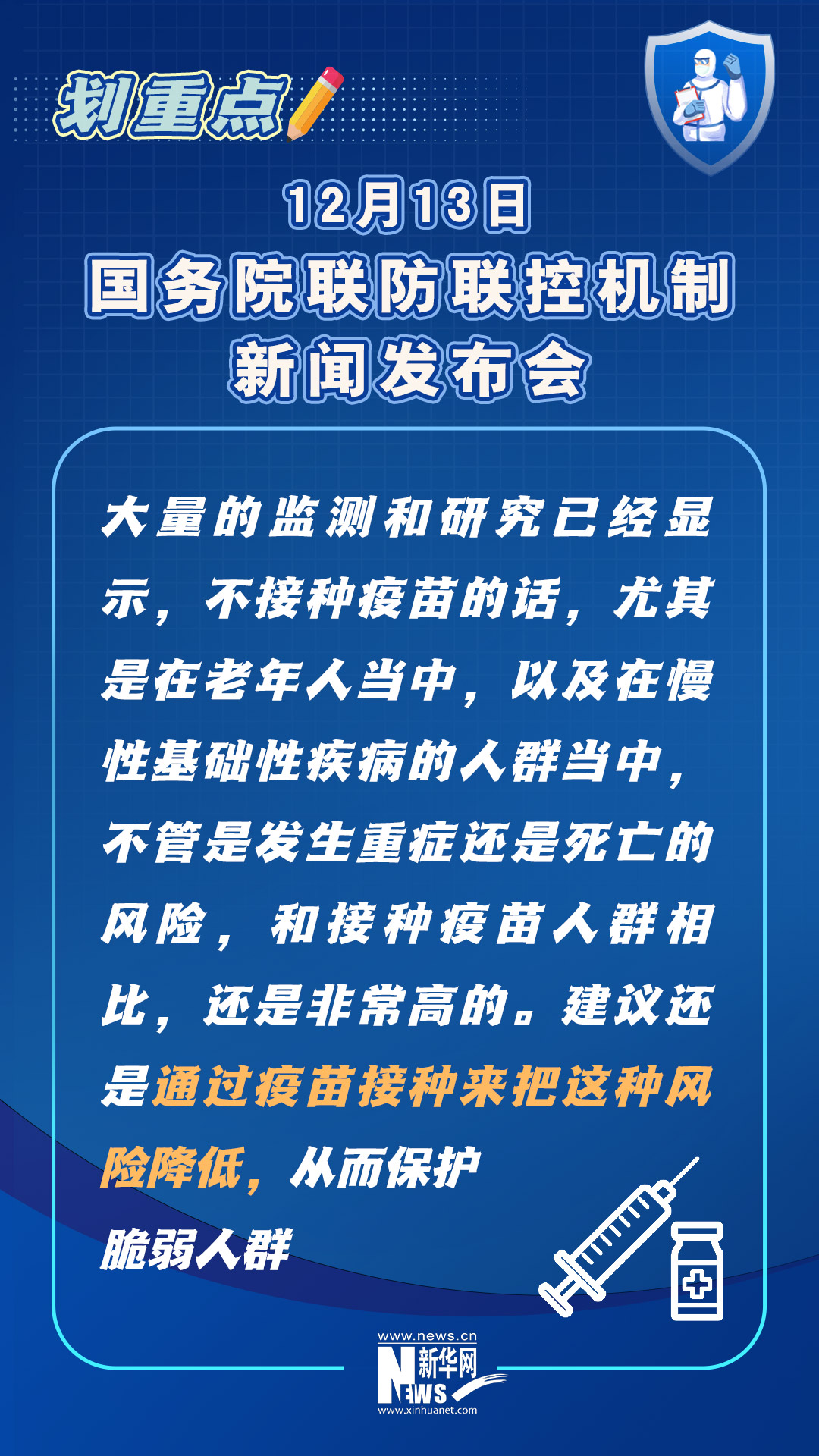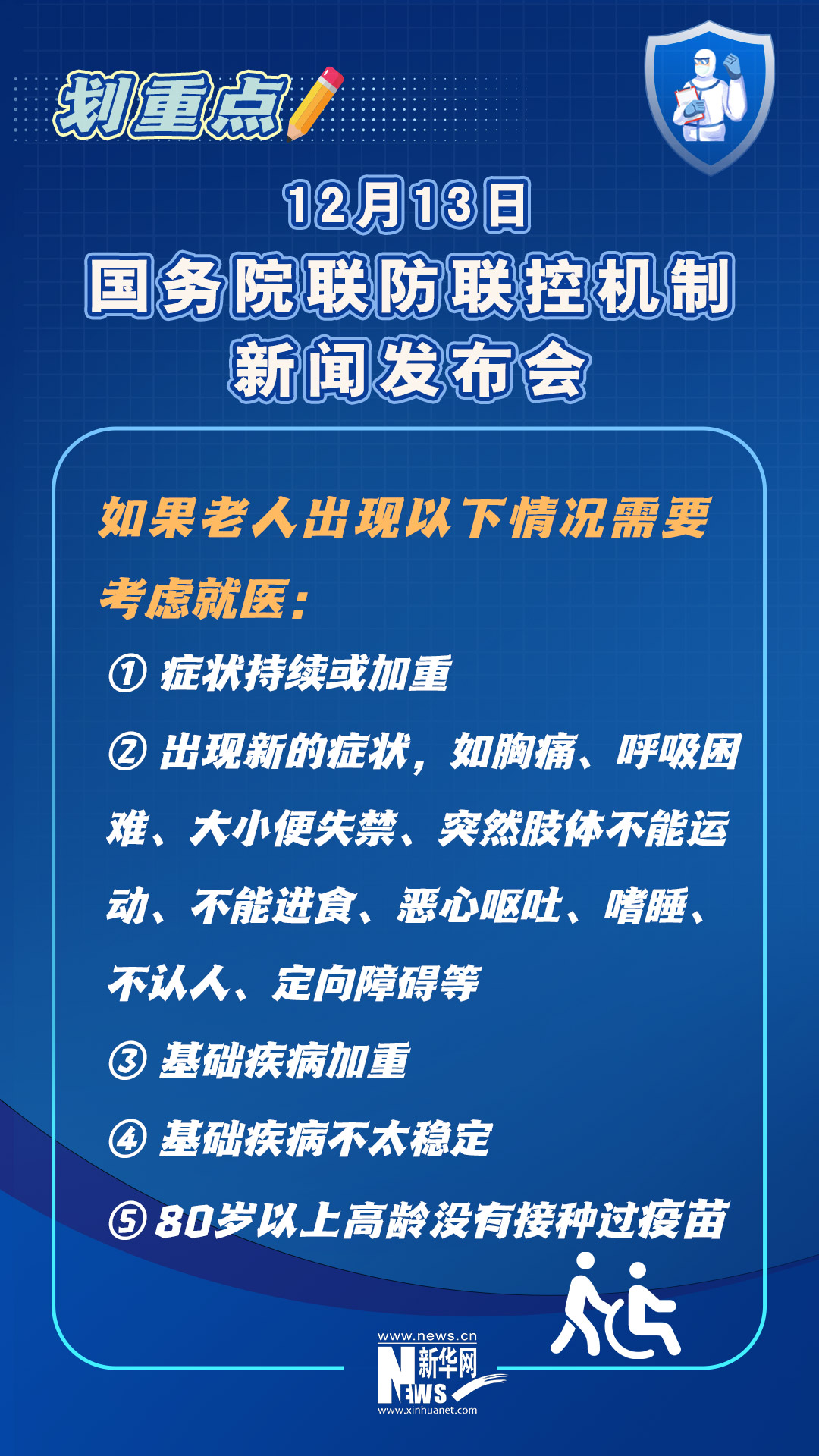 当前,老年人、孕产妇、儿童、慢性基础性疾病患者等重点人群的健康管理备受关注。在12月13日下午召开的国务院联防联控机制新闻发布会上,专家对大家普遍关心的如老年人接种疫苗的安全性如何、老年人感染后居家治疗该注意什么、孕产妇如何做好防护避免感染、儿童发热后什么情况下需要就医等问题给出权威解答。