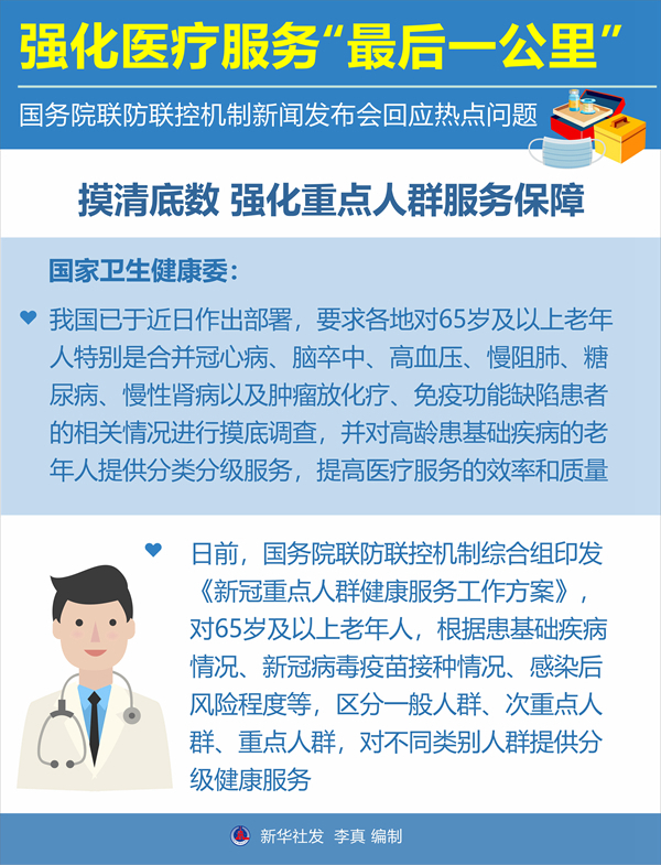 国家卫生健康委基层卫生健康司司长聂春雷说,要摸清重点人群的底数并进行分类管理。他介绍,我国已于近日作出部署,要求各地对65岁及以上老年人特别是合并冠心病、脑卒中、高血压、慢阻肺、糖尿病、慢性肾病以及肿瘤放化疗、免疫功能缺陷患者的相关情况进行摸底调查,并对高龄患基础疾病的老年人提供分类分级服务,提高医疗服务的效率和质量。