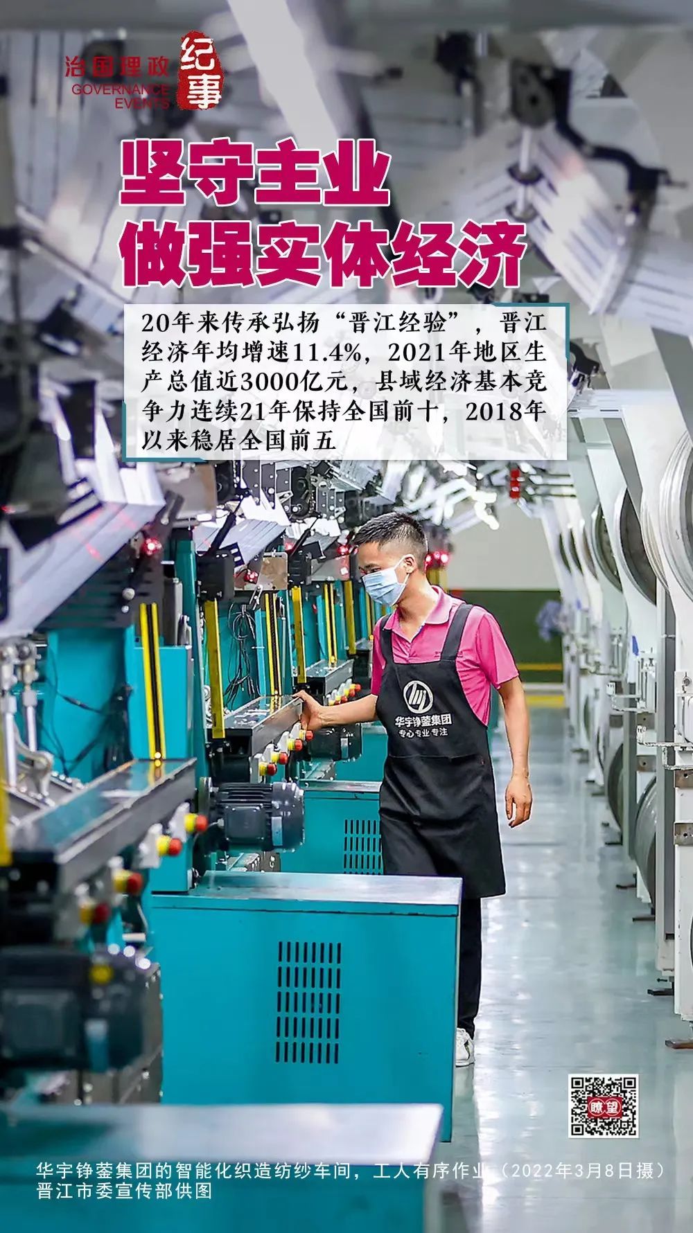 20年来传承弘扬“晋江经验”,晋江经济年均增速11.4%,2021年地区生产总值近3000亿元,县域经济基本竞争力连续21年保持全国前十,2018年以来稳居全国前五。