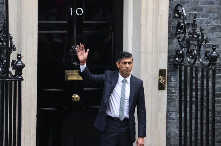 10月25日,新就任的英国首相里希·苏纳克发表讲话后在伦敦唐宁街10号的首相府前挥手致意。新华社记者李颖摄