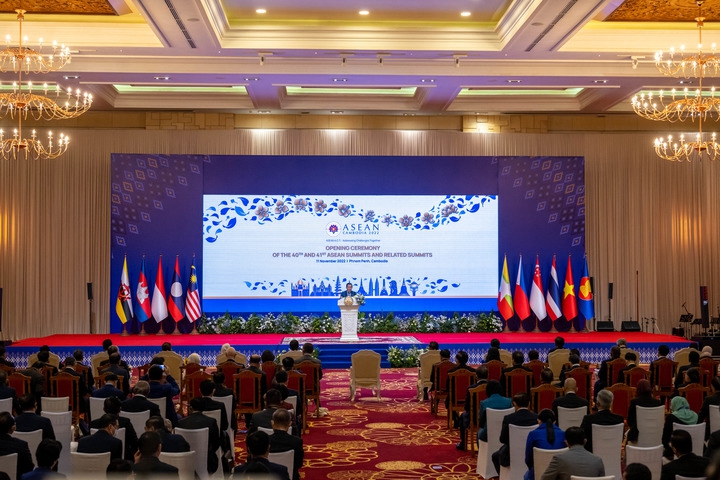 11月11日,在柬埔寨首都金边,柬埔寨首相洪森在第40届和第41届东盟峰会开幕式上致辞。新华社记者朱炜摄