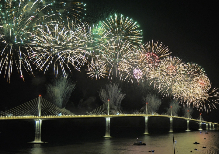 这是7月26日在克罗地亚科马尔纳拍摄的由中企承建的佩列沙茨大桥通车仪式上的焰火表演。新华社记者李学军摄