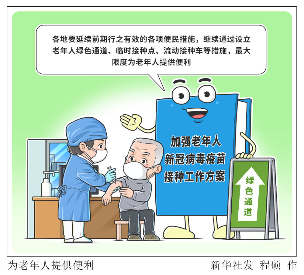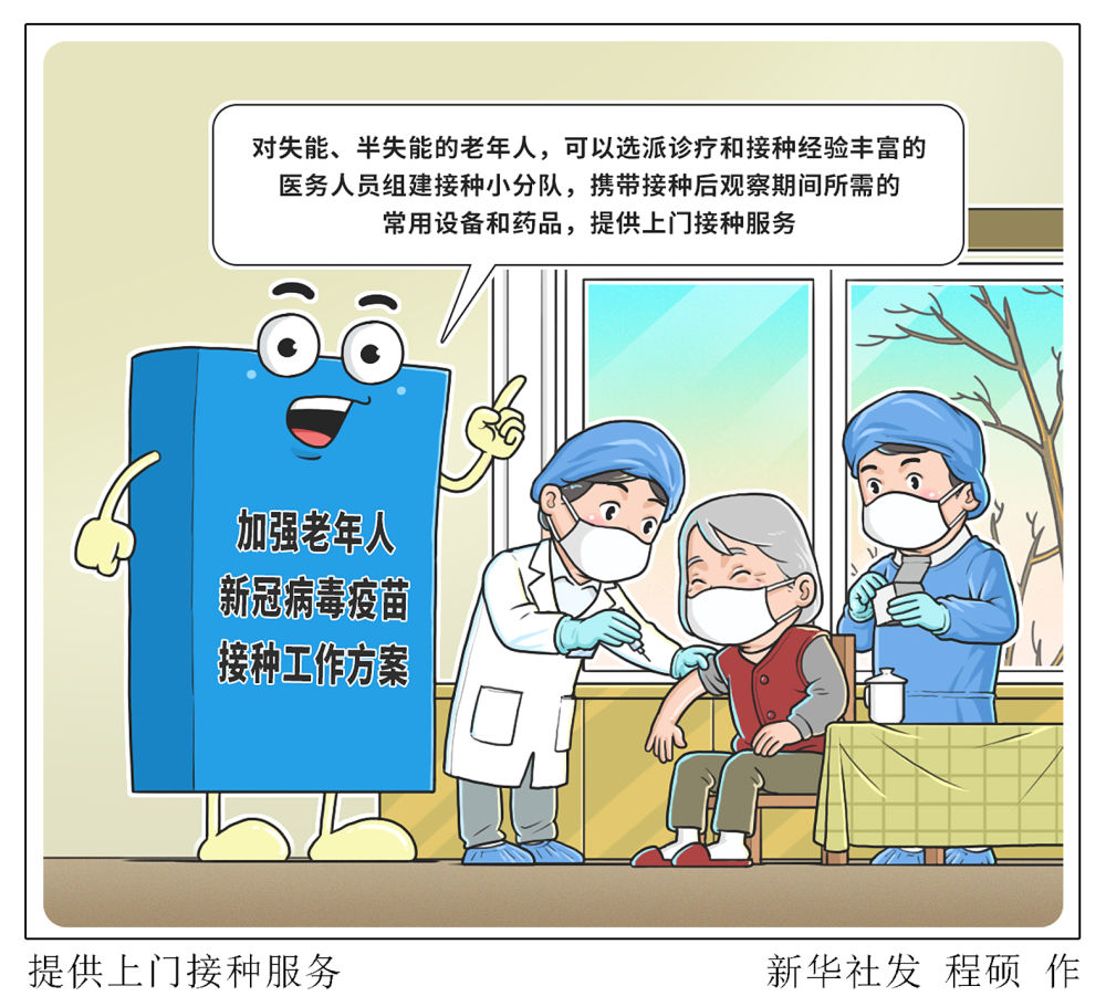 《加强老年人新冠病毒疫苗接种工作方案》明确,各地要延续前期行之有效的各项便民措施,继续通过设立老年人绿色通道、临时接种点、流动接种车等措施,最大限度为老年人提供便利。对失能、半失能的老年人,可以选派诊疗和接种经验丰富的医务人员组建接种小分队,携带接种后观察期间所需的常用设备和药品,提供上门接种服务。