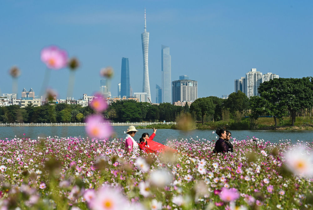 游客徜徉在广州海珠湿地海珠湖畔波斯菊花海之中(2020年11月3日摄)。新华社记者 刘大伟 摄