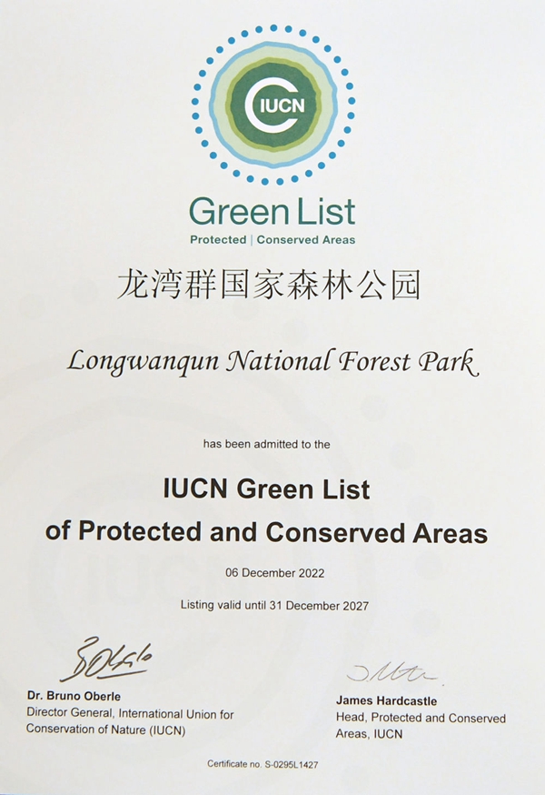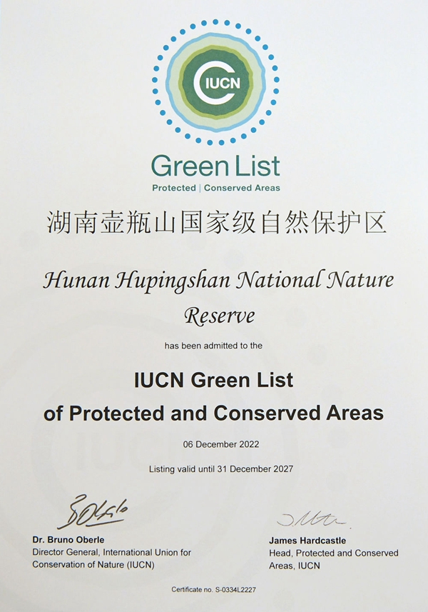 这是在加拿大蒙特利尔拍摄的湖南壶瓶山国家级自然保护区获得的世界自然保护联盟绿色名录证书(2022年12月14日摄)。新华社记者 任鹏飞 摄