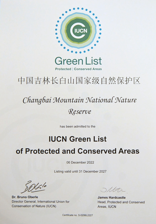 这是在加拿大蒙特利尔拍摄的吉林长白山国家级自然保护区获得的世界自然保护联盟绿色名录证书(2022年12月14日摄)。新华社记者 任鹏飞 摄