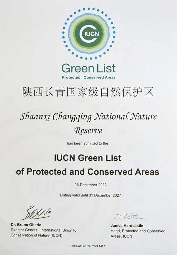 这是在加拿大蒙特利尔拍摄的陕西长青国家级自然保护区获得的世界自然保护联盟绿色名录证书(2022年12月14日摄)。新华社记者 任鹏飞 摄