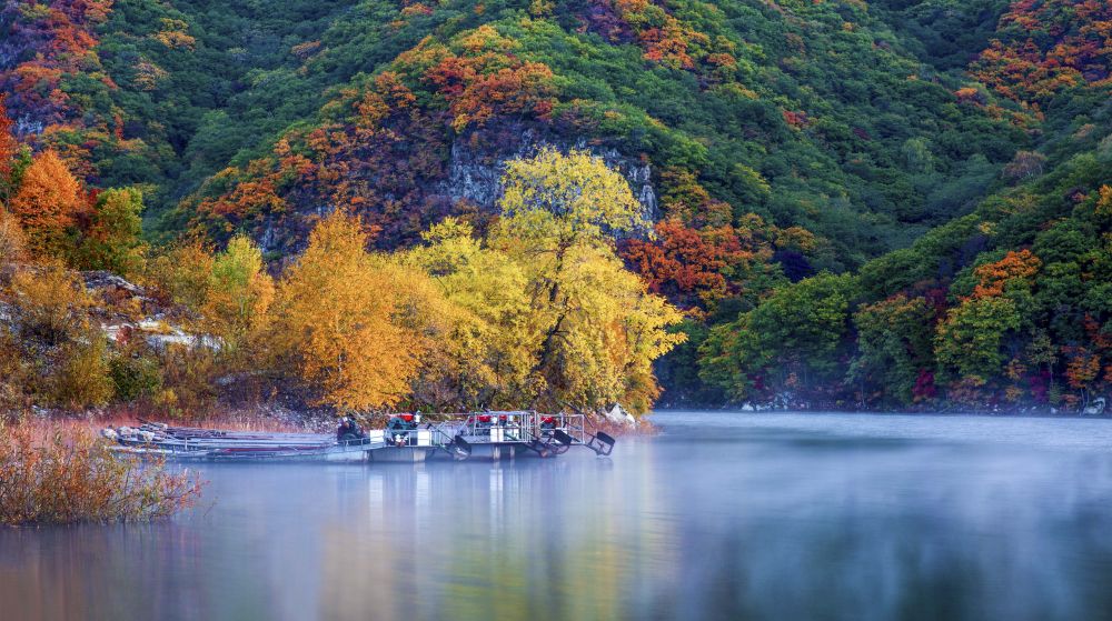 游人乘坐游船在吉林龙湾群国家森林公园内游玩(2020年9月22日摄)。新华社记者 许畅 摄