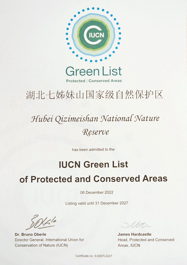 这是在加拿大蒙特利尔拍摄的湖北七姊妹山国家级自然保护区获得的世界自然保护联盟绿色名录证书(2022年12月14日摄)。新华社记者 任鹏飞 摄